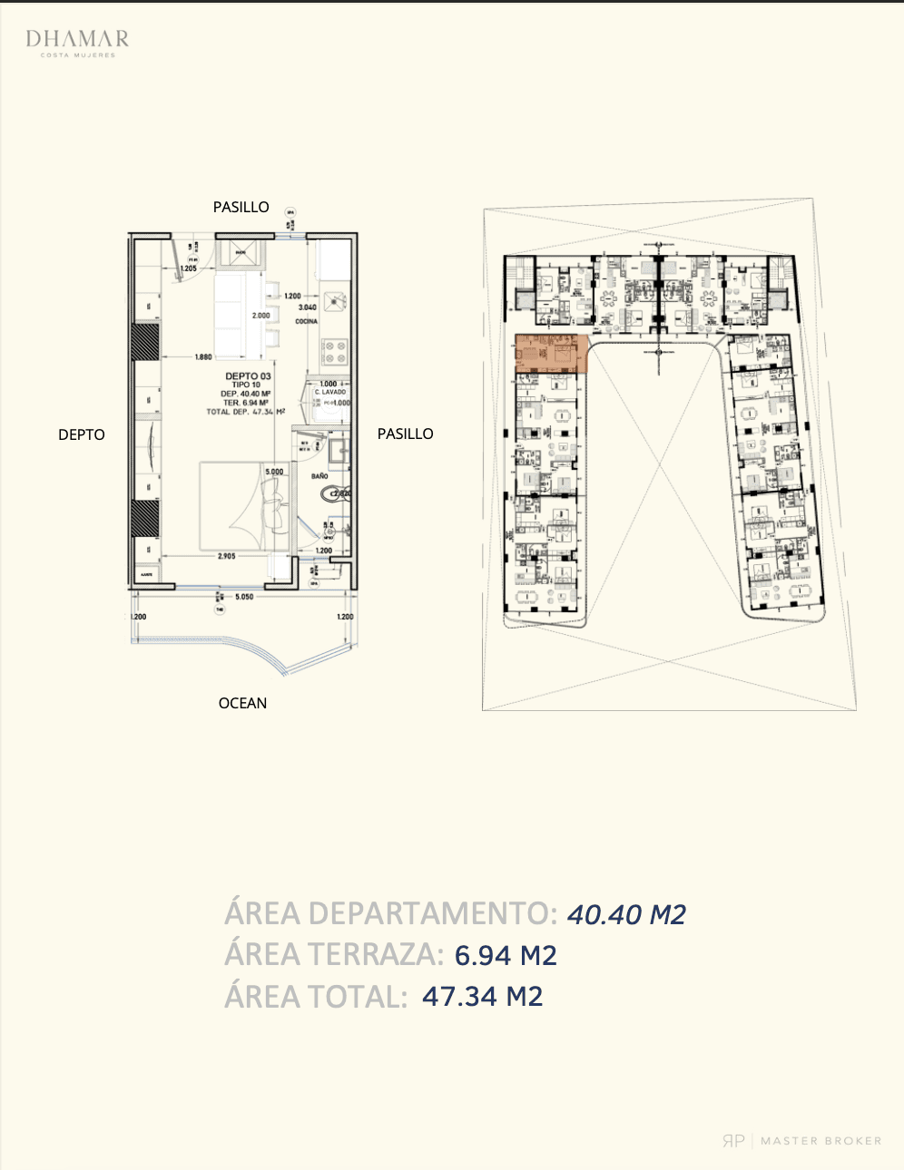 Departamento compacto de una habitación con distribución eficiente que maximiza cada metro cuadrado. Cuenta con una recámara amplia, baño completo, cocina integrada, sala de estar y terraza privada con vista al mar Caribe. Su posición lateral en el edificio garantiza privacidad y excelente iluminación natural. Incluye closet de lavado independiente. Perfecto como inversión para renta vacacional o como primera propiedad en la Riviera Maya.
