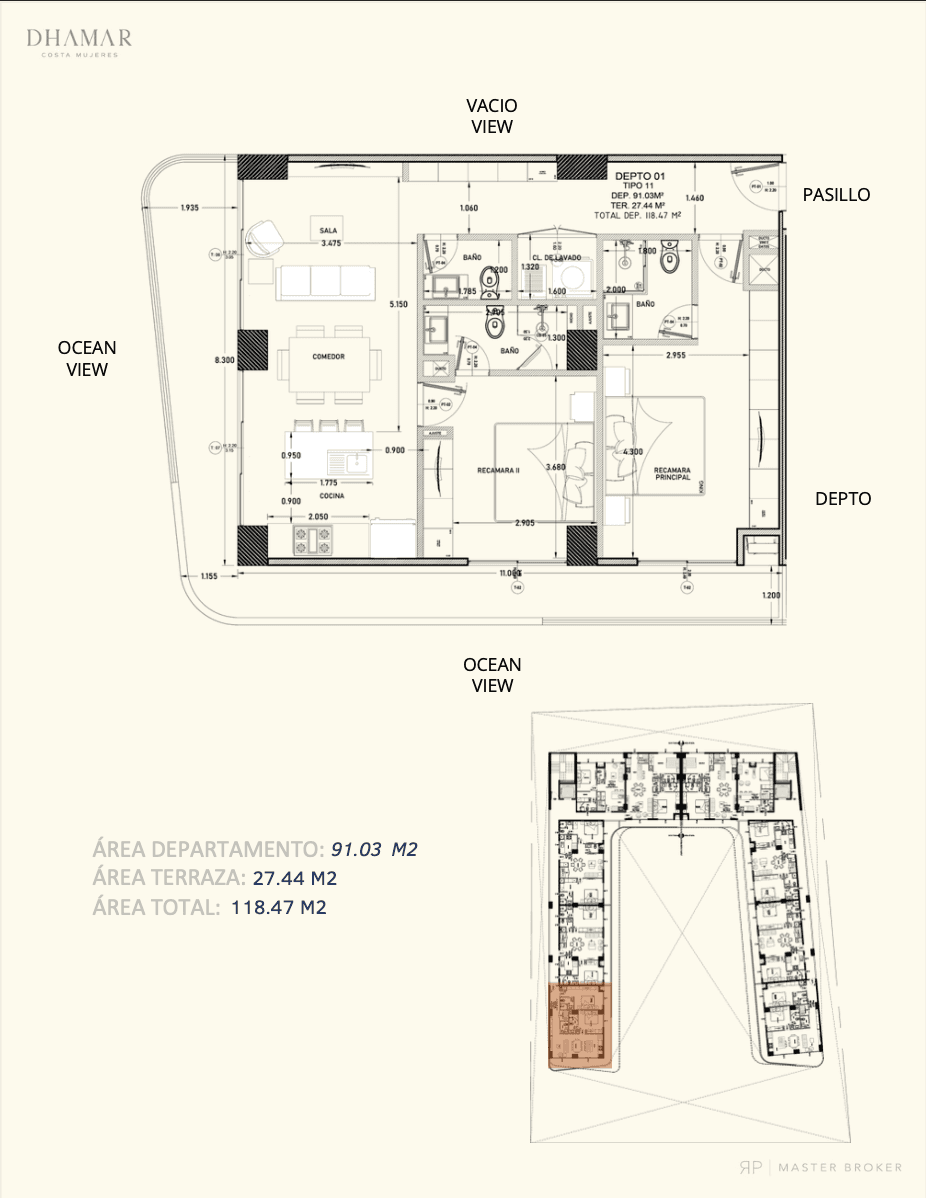 Departamento de esquina de dos habitaciones que ofrece una experiencia de vida excepcional con vistas panorámicas desde múltiples ángulos. Su posición privilegiada en la esquina del edificio permite triple exposición: océano, vacío y vista lateral, bañando cada espacio con luz natural. La generosa terraza envolvente de más de 27 m² es perfecta para disfrutar del entorno caribeño. Incluye recámara principal y segunda recámara con baños completos, amplia sala-comedor, cocina equipada y closet de lavado. Con 118 m² totales, es la opción premium dentro de las unidades de dos recámaras.