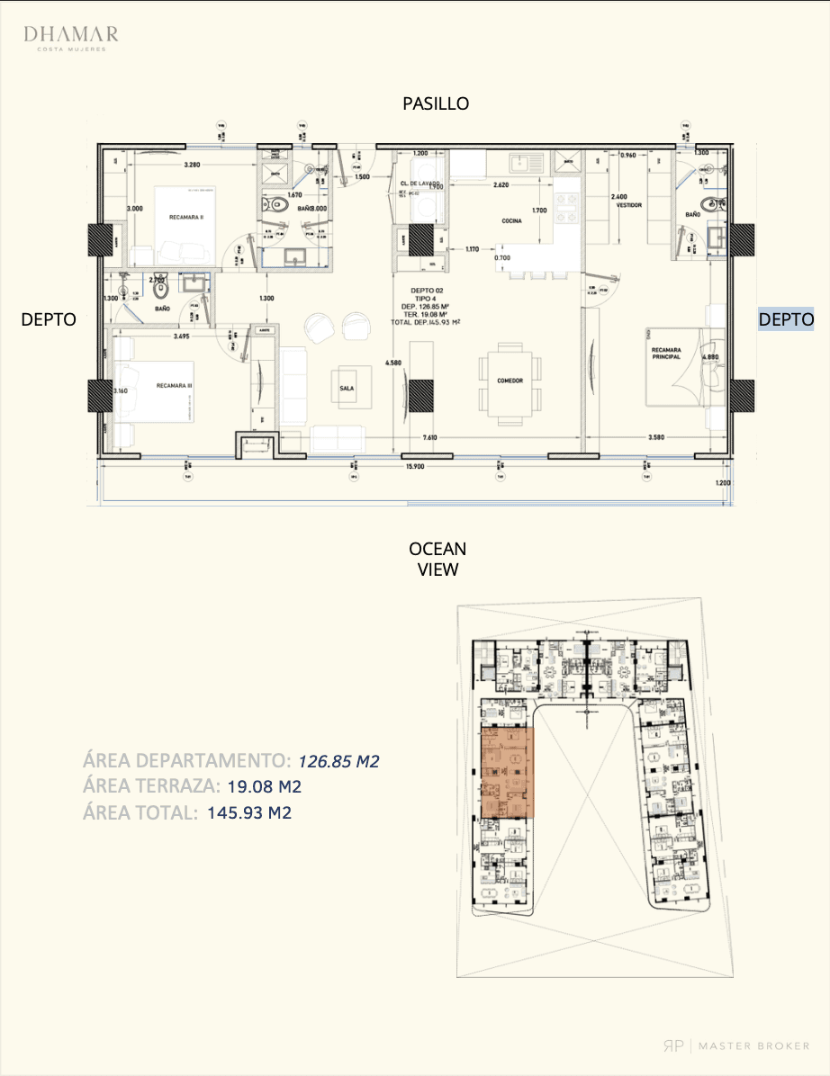 Amplio departamento de tres recámaras con vista al océano, vestidor en la suite principal y casi 146 m² de espacio total.