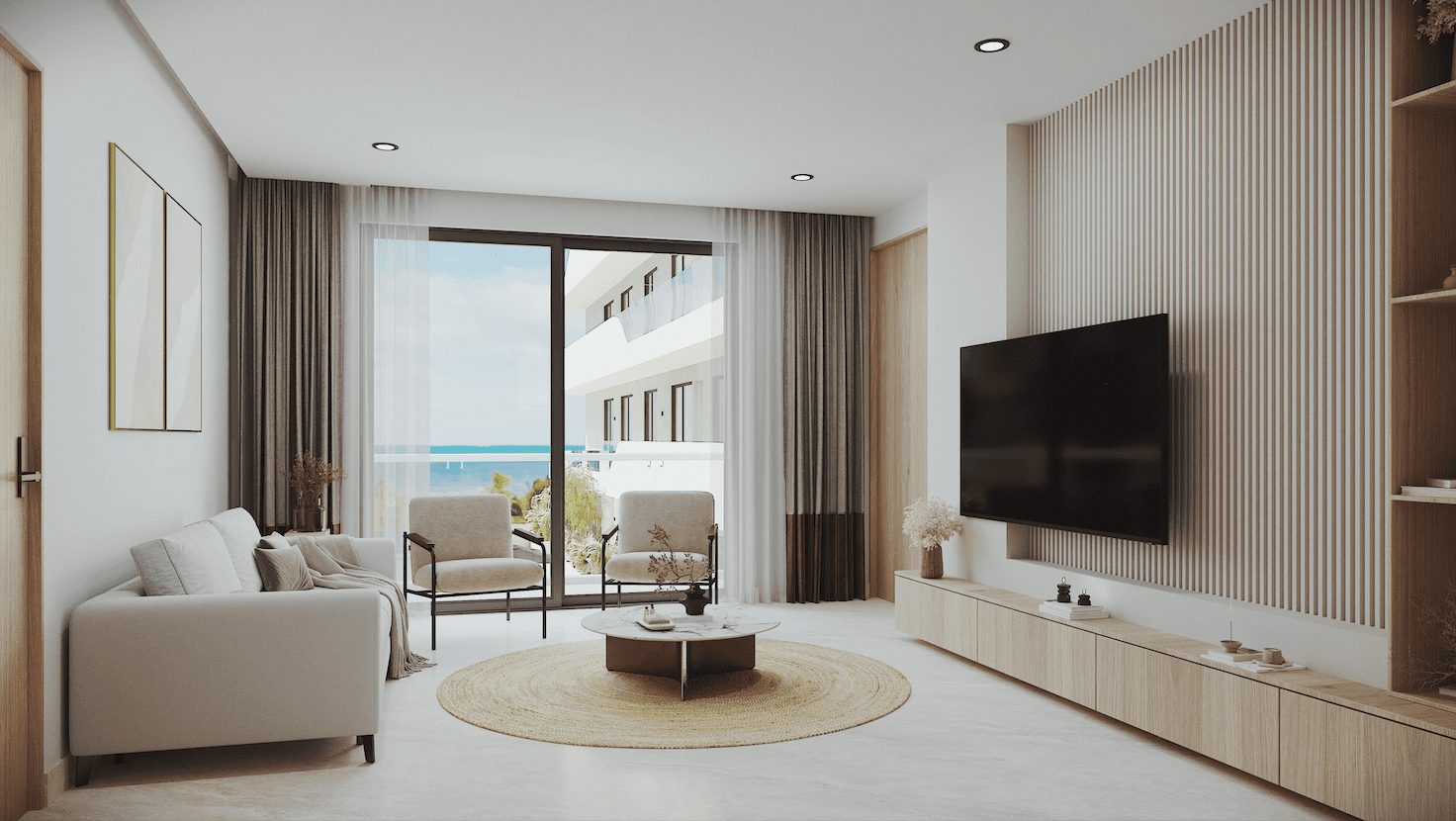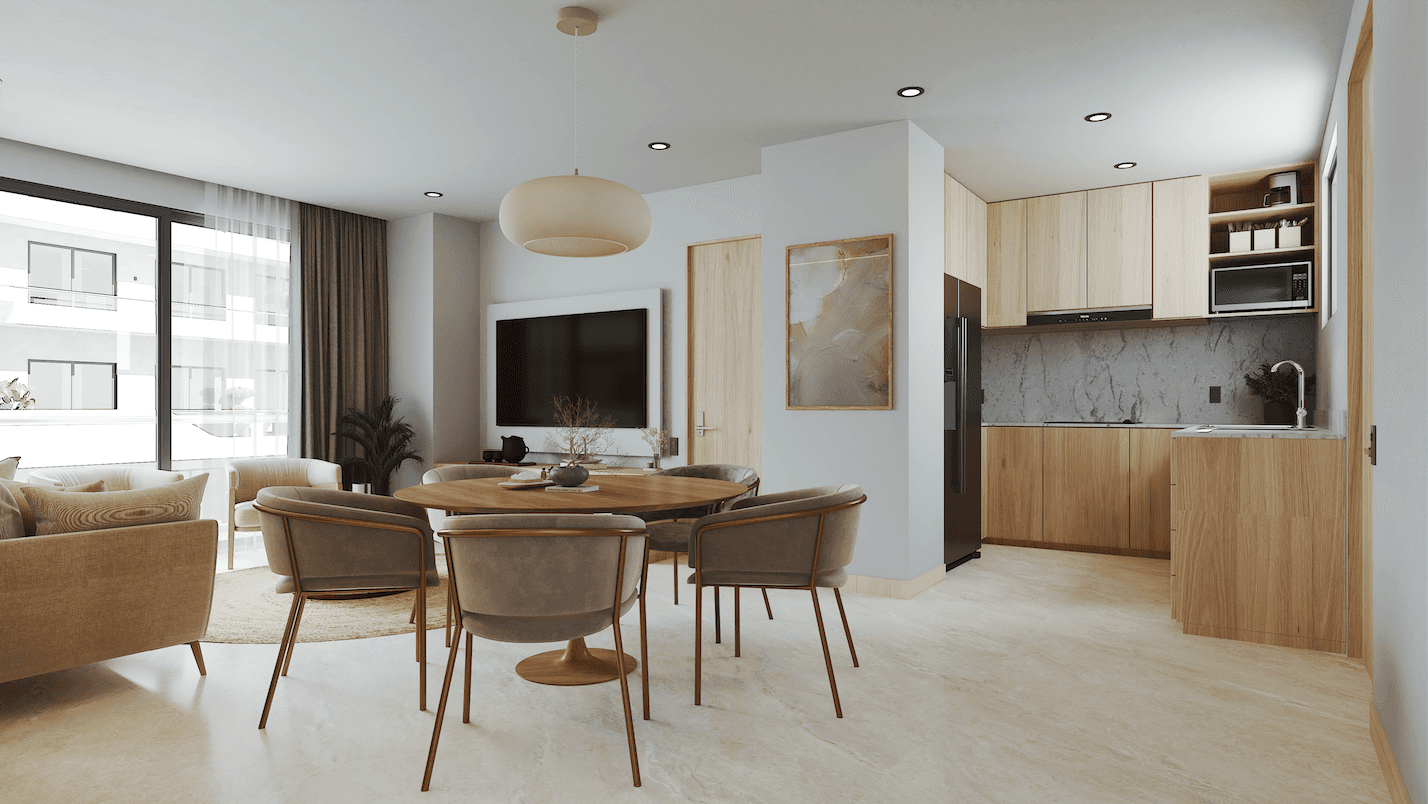 Espacioso departamento de tres habitaciones diseñado para quienes buscan el máximo confort frente al mar Caribe. La recámara principal cuenta con vestidor independiente y baño completo, complementada por dos recámaras adicionales y un segundo baño. La zona social de concepto abierto integra sala, comedor y cocina en un espacio fluido que se extiende hacia la terraza de 19 m² con vista directa al océano. Con casi 146 m² totales, es la opción ideal para familias que desean vivir o vacacionar con amplitud en Costa Mujeres, sin renunciar a la exclusividad del desarrollo.